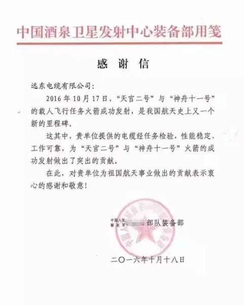 時間拉回七年前,遠(yuǎn)東電纜收到過一封來自酒泉衛(wèi)星發(fā)射中心的感謝信,記錄了“緊急時刻”下遠(yuǎn)東電纜與中國航天的鏈接。2016年9月16日晚近12時,“神舟十一號”發(fā)射工作已經(jīng)進(jìn)入調(diào)試階段,遠(yuǎn)東電纜突然接到來自酒泉衛(wèi)星發(fā)射中心的電話,中心表示希望公司能在三天內(nèi),趕制一批航空用高端電纜產(chǎn)品并送至酒泉,助力航天基地建設(shè)及“神州十一號”發(fā)射?!肮窘拥饺蝿?wù)快速反應(yīng),立即停下手頭所有訂單的生產(chǎn),全力趕工,最終用72小時的“火箭速度”不辱使命交上滿意答卷?!边h(yuǎn)東電纜相關(guān)負(fù)責(zé)人表示。