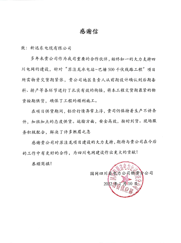 此外負(fù)責(zé)該項目的專業(yè)技術(shù)人員的技術(shù)能力與服務(wù)水平也得到了客戶的一致好評,在工程施工中,給予了多次現(xiàn)場技術(shù)服務(wù)與支持,為項目的順利推進(jìn)帶來了很大便利。為了表示感謝,國網(wǎng)四川省電力公司物資分公司還專門為新遠(yuǎn)東電纜發(fā)來一封感謝信,信中特別表揚(yáng)道,新遠(yuǎn)東電纜不僅短時間內(nèi)準(zhǔn)時供貨,而且還從前期設(shè)計確認(rèn)到后期備料、排產(chǎn)、運(yùn)輸?shù)雀鳝h(huán)節(jié)都給予了該項目大力支持,真正做到了急客戶所急、想客戶所想!在供貨期間,面對鋁價行情異常上浮的情況,新遠(yuǎn)東電纜仍保持著生產(chǎn)不講條件、加班加點(diǎn)的態(tài)度供貨,確保了工程的順利施工??梢姡瑖W(wǎng)四川省電力公司物資分公司對新遠(yuǎn)東電纜提供的周到、熱情服務(wù)予以了極高評價。